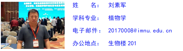 刘素军,男,汉族,中共党员,博士,高级实验师,学术型导师,实验中心主任。主要研究方向:马铃薯栽培生理及抗逆性研究,主持国家自然科学基金项目一项,校级项目1项。发表学术论文18篇。承担本科生课程:《植物生理学实验》。发表研究论文18篇。