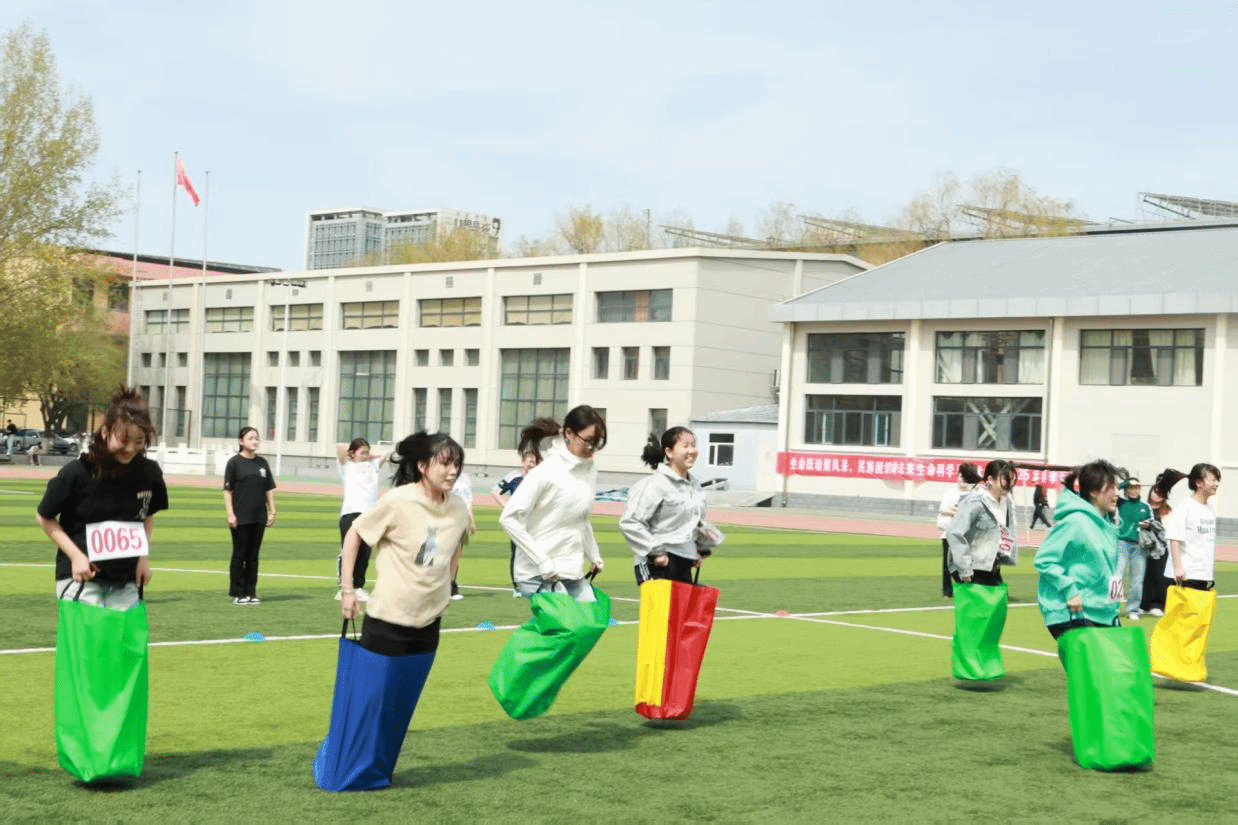 在游戏袋鼠跳中,参与者站入特制的袋子中,双手紧握袋口,化身灵动的袋鼠,从起点出发,一跃一跃地跨越25米的跑道,向终点发起冲击。这不仅是速度的比拼,更是平衡与技巧的考验。这个游戏通过趣味性和挑战性相结合,激发了师生的运动热情,增强了身体素质,培养了坚韧不拔的精神和团队凝聚力。