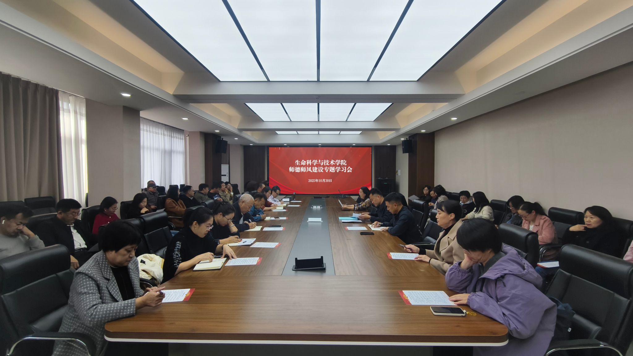 为进一步加强师德师风建设,深入贯彻落实新时代教师职业行为准则,营造风清气正的育人环境,10月30日下午,学院在生物楼三楼会议室召开师德师风专题学习会,学院全体教职工参加会议。